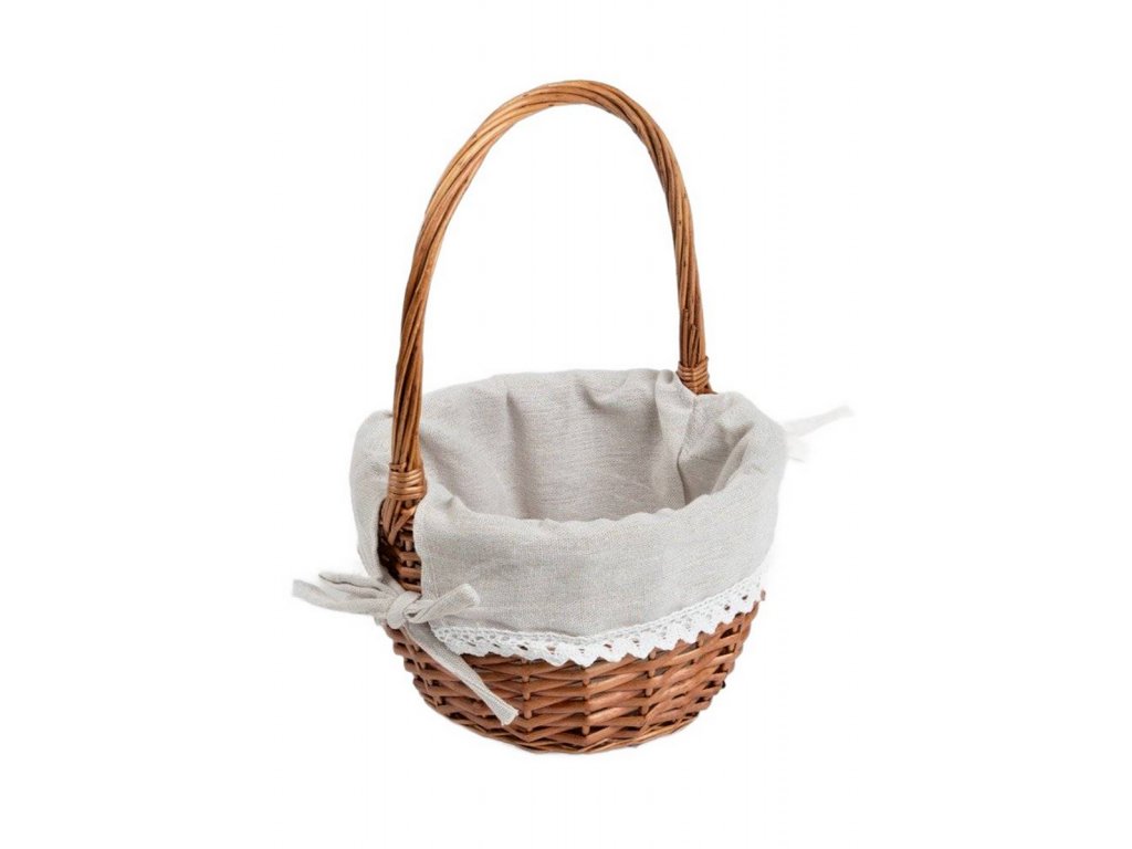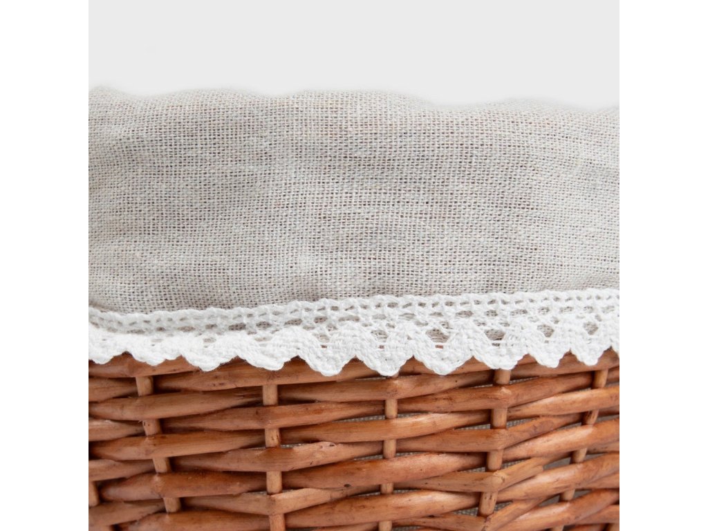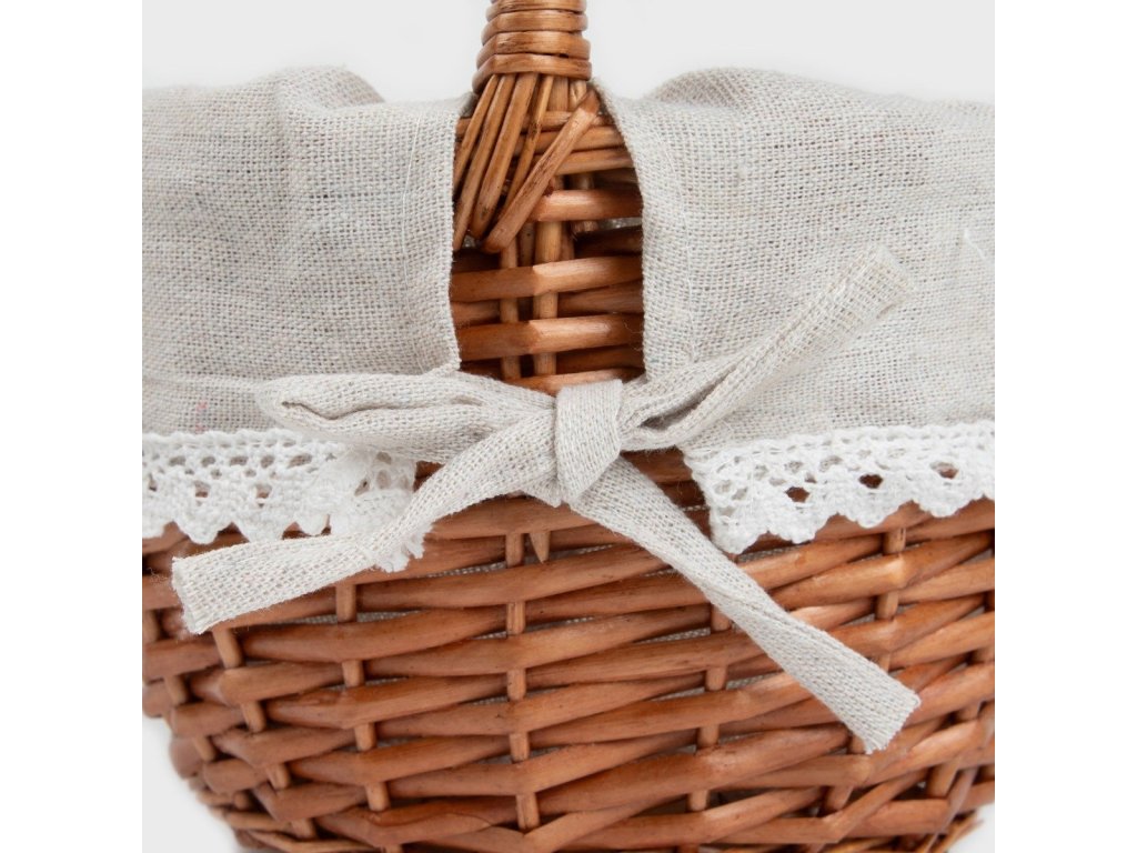 Přírodní design s rustikálním charakterem - Stylový a praktický interiérový doplněk - Proutěný koš, malý 20 cm. Košík v malé velikosti je esencí přírodního stylu a jemnosti. Je vyroben z proutí a doplněn lněnou tkaninou s jemným krajkovým lemem, takže se dokonale hodí do každého interiéru a dodá mu útulnost a teplo.