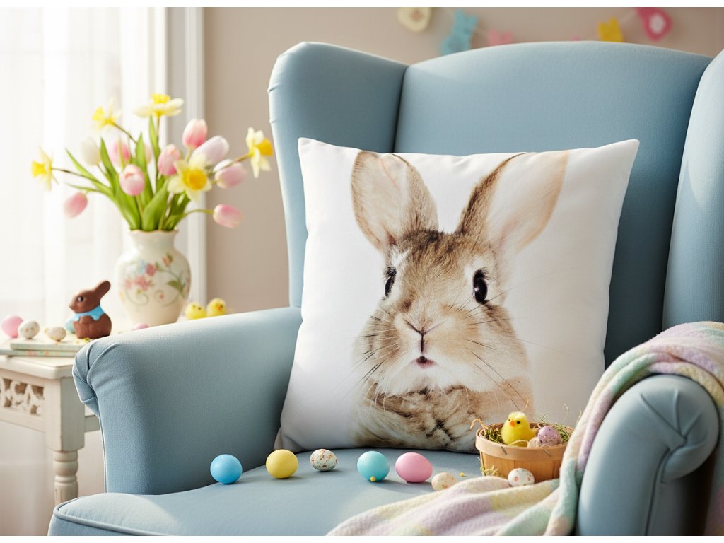 Povlak na polštář s motivem králíka je zajímavou dekorací s velikonočním charakterem. Doplní sváteční výzdobu ložnice i obývacího pokoje a lze ji kombinovat s textilem v univerzálních barvách, například s béžovou dekou. Díky tlumeným barvám a svátečnímu charakteru může podtrhnout velikonoční akcent jakéhokoli stylu uspořádání.