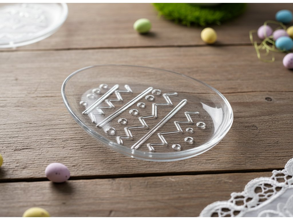 Velikonoční motiv - tvar velikonočního vajíčka - Rozměry: 19 x 14 cm (v x š) - Průhledné sklo  - Velikonoční talíř ve tvaru velikonočního vajíčka