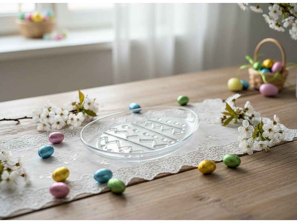 Talíř je ideální jako nádobí na velikonoční snídani nebo slavnostní setkání u stolu s rodinou. Můžete jej použít k servírování občerstvení nebo jej použít jako talíř, na kterém vystavíte ručně malovaná velikonoční vajíčka. Díky transparentní barvě a minimalistickému designu talíř snadno zapadne do jakékoli kompozice stolu.