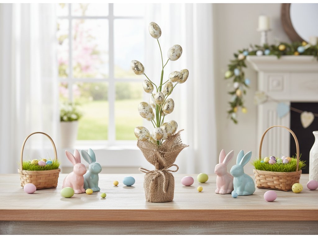 Velikonoční stromeček je dokonalým způsobem, jak dodat svátečnímu aranžmá jiskru. Skvěle bude vypadat na komodě v doprovodu zajíčka, beránka a tradičních velikonočních vajíček. Můžete je také postavit doprostřed velikonočního stolu. Zlatá vajíčka krásně odrážejí světlo a vytvářejí v interiéru hřejivou a útulnou atmosféru.