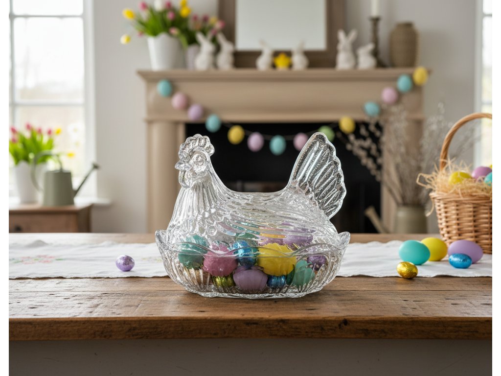 Stylový design ve tvaru slepice - Průhledné sklo s jemnou strukturou - Velká nádoba na slepici 22x18 cm