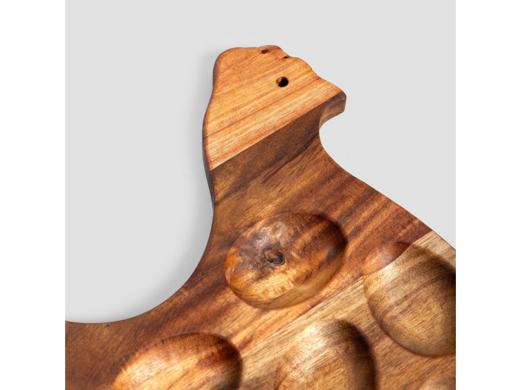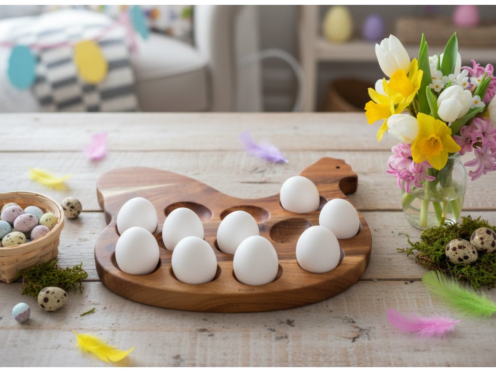 Podnos na vajíčka je originální součástí vaší velikonoční výzdoby. Je vyroben z přírodního dřeva a zaujme svým teplým odstínem a originálním tvarem slepičky. Je to nejen funkční podnos na vajíčka, ale také stylový doplněk, který podtrhne sváteční náladu.
