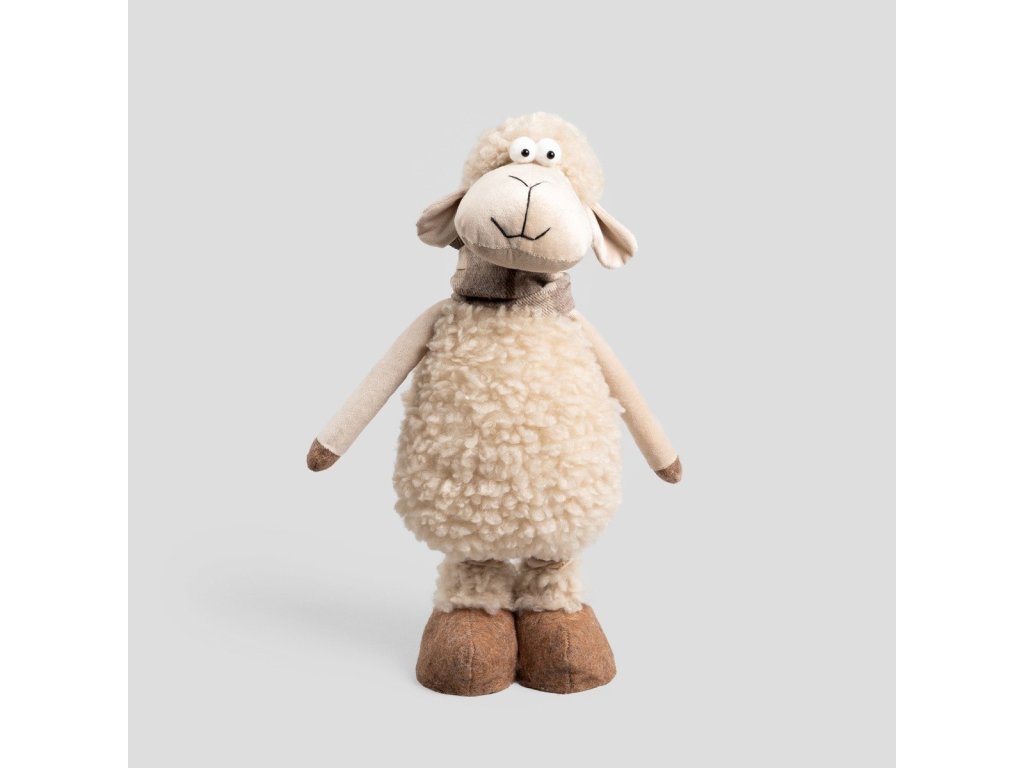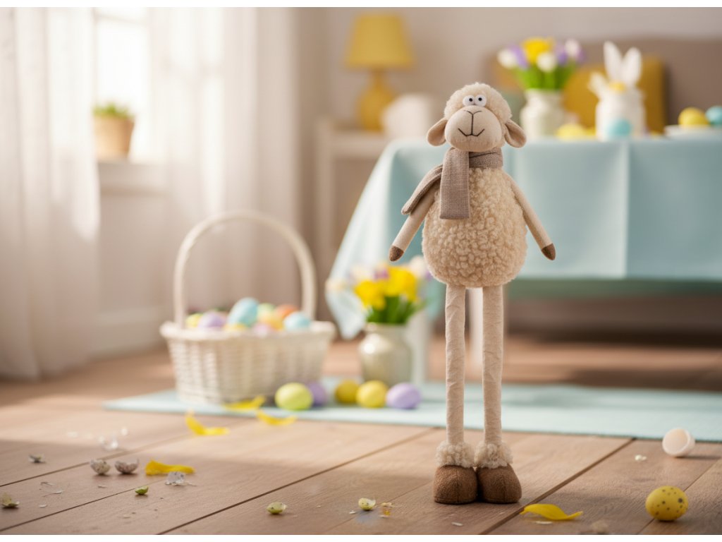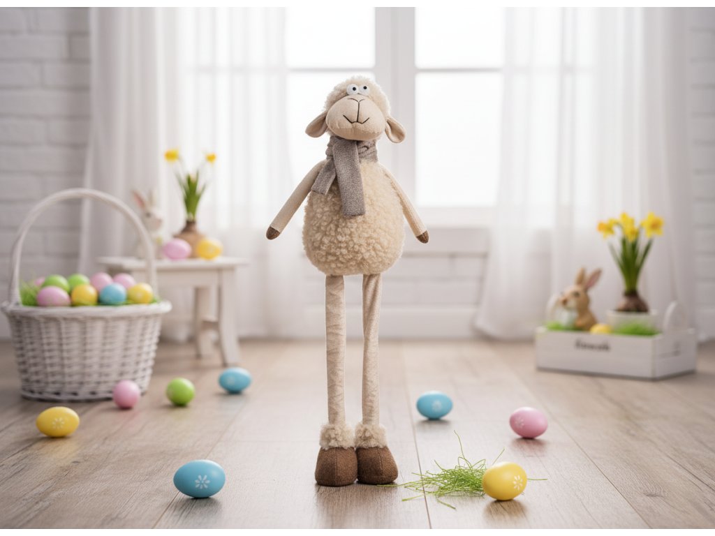 Originální design inspirovaný jarními dekoracemi - Beránek v béžové barvě s hnědými akcenty - Teleskopické nohy - nastavitelná výška až 70 cm - Měkký materiál příjemný na dotek