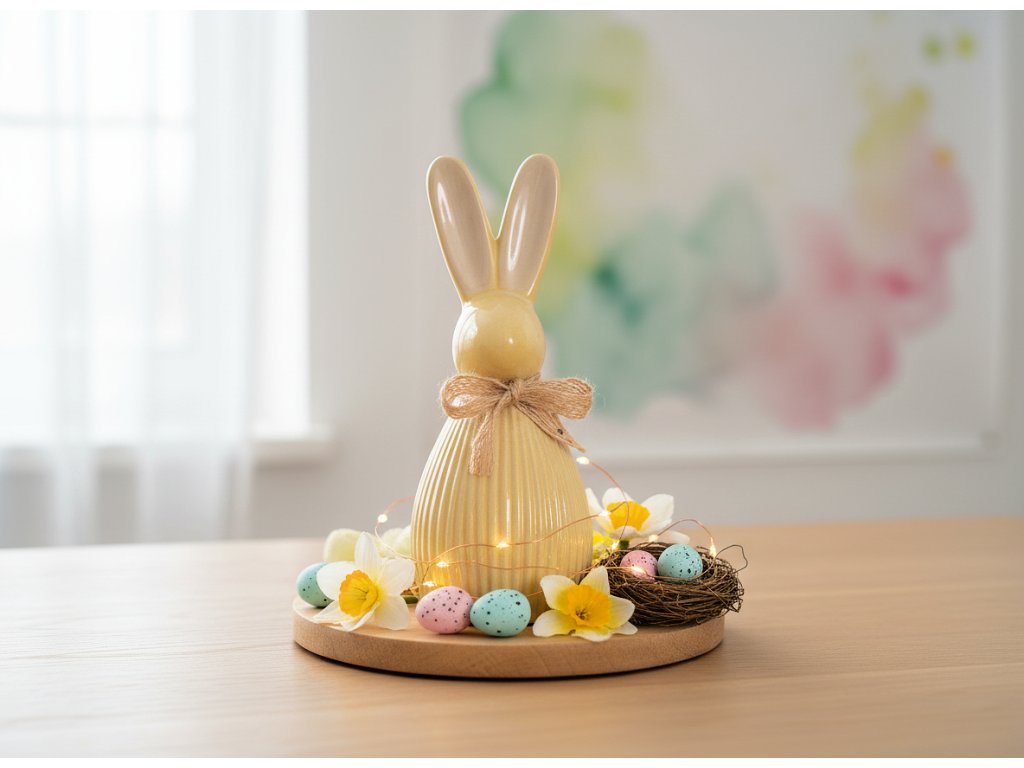 Existují detaily, které dokážou během několika okamžiků proměnit atmosféru interiéru. Figurka vnáší do prostoru radost a vizuální svěžest. Spodní část má rýhovaný povrch, který tvar organizuje. Horní část – hlava a uši – je hladká, což vytváří jasný kontrast. Světlejší barva uší dodává figurce lehkost a jemně zpestřuje její vzhled. Dekorativní mašle v přírodní barvě figurku doplňuje a poskytuje jasný finální detail. Jedná se o dekoraci, která se dobře hodí do sezónních kompozic.