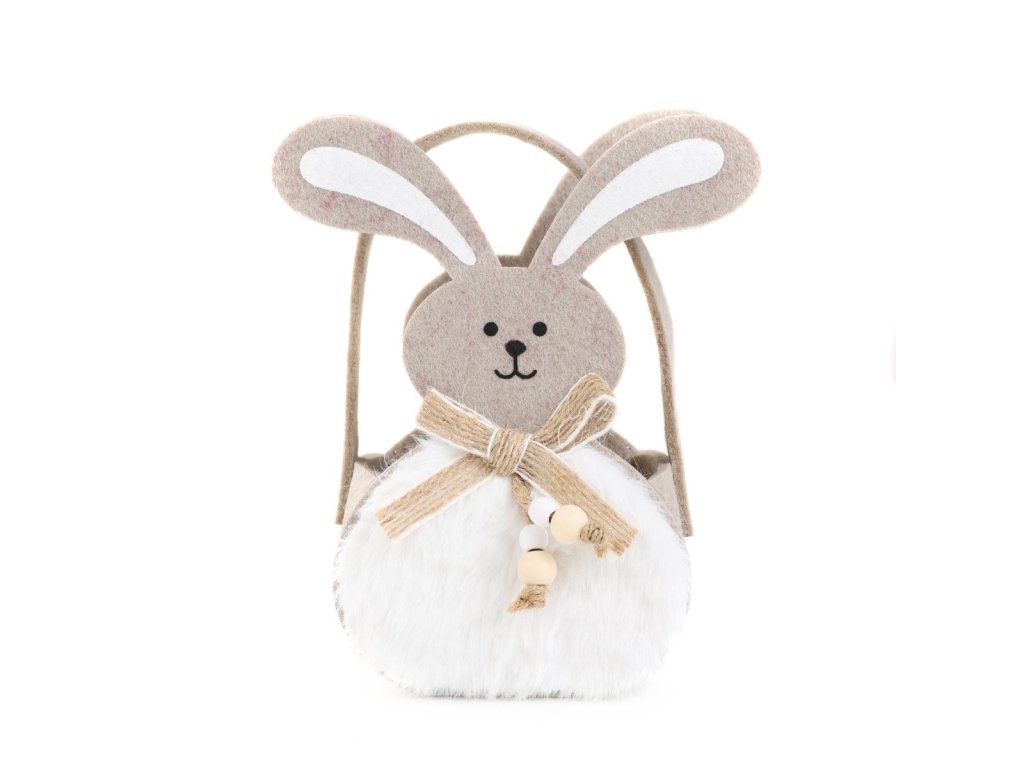 Plstěný velikonoční košík zaujme na první pohled svým rozkošným tvarem zajíčka. Se svou usměvavou tváří, velkýma ušima a bílým kožíškem vypadá zajíček velmi přátelsky a vnáší do místnosti hřejivý, veselý nádech. Košík je ideální jako velikonoční dekorace do interiéru i jako místo pro dětský velikonoční košík.