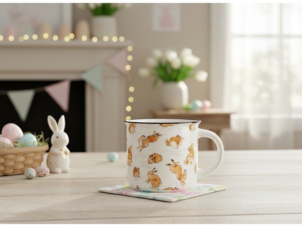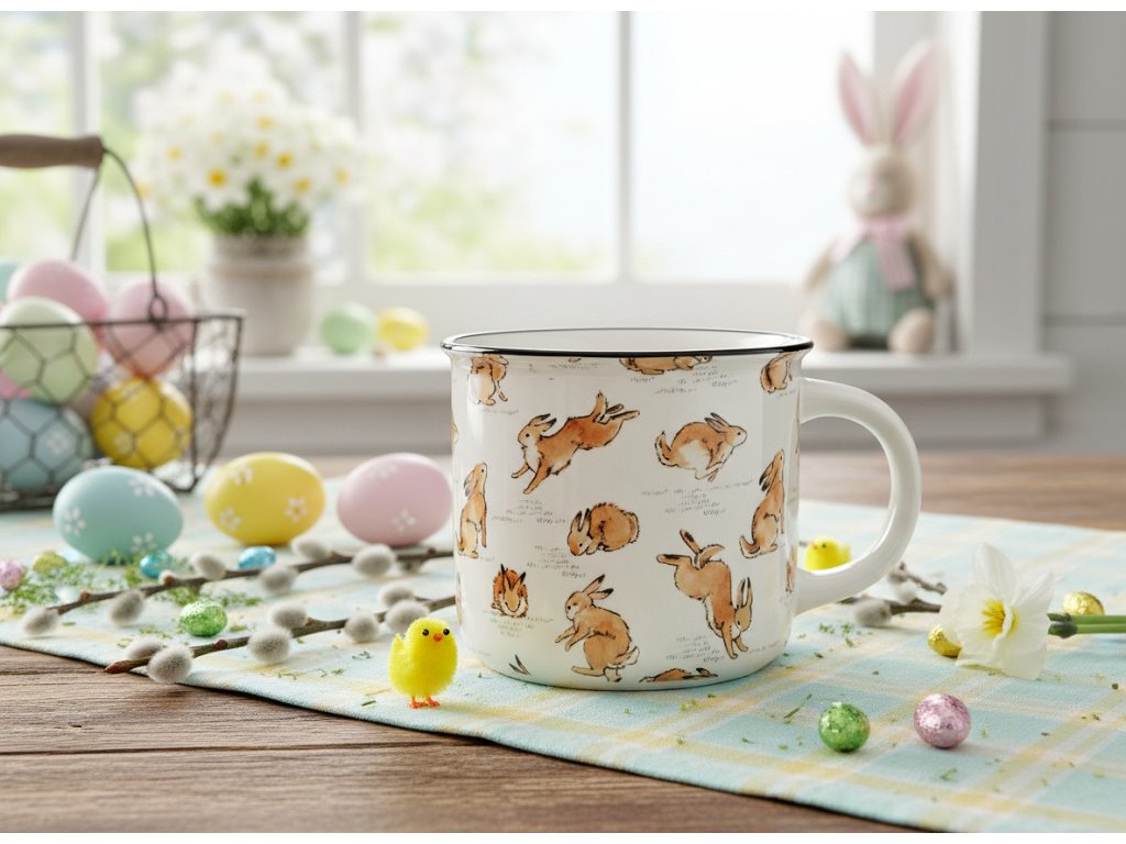 Hrníček osloví každého, kdo si rád vychutnává horké nápoje, a zároveň doplní velikonoční design interiéru. Bílý povrch nádoby je zdoben mnoha zajíci zobrazenými v pohybu a černým okrajem, který obepíná horní okraj hrnku.