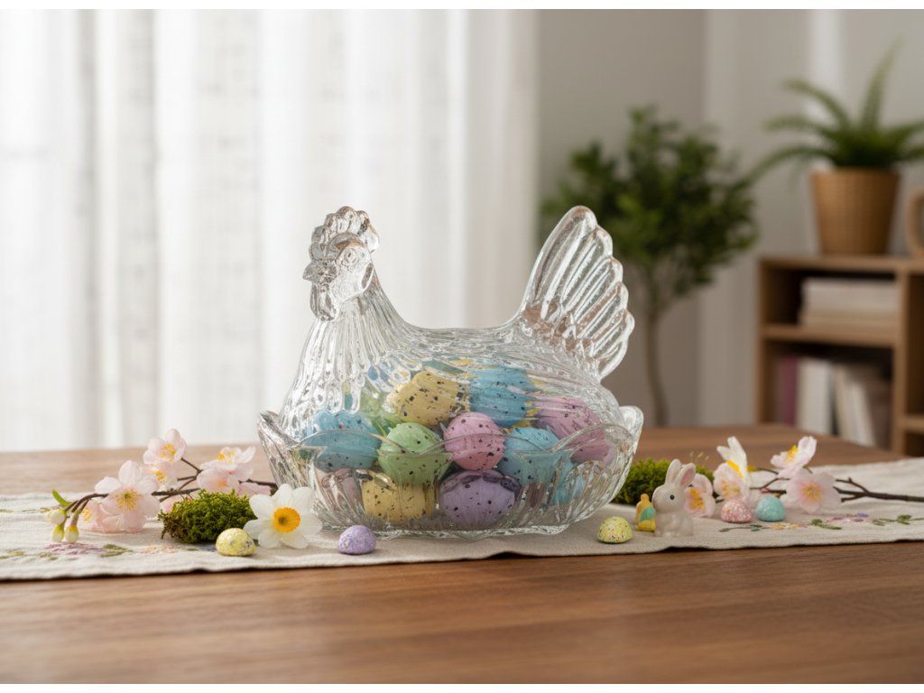 Vneste do svého domova eleganci a šarm s dózou ve tvaru slepice. Je vyrobena z průhledného skla s jemnou strukturou a zaujme nejen svým vzhledem, ale i praktičností. Je dokonalým doplňkem velikonočního stolu nebo dekorativním prvkem pro každodenní použití.