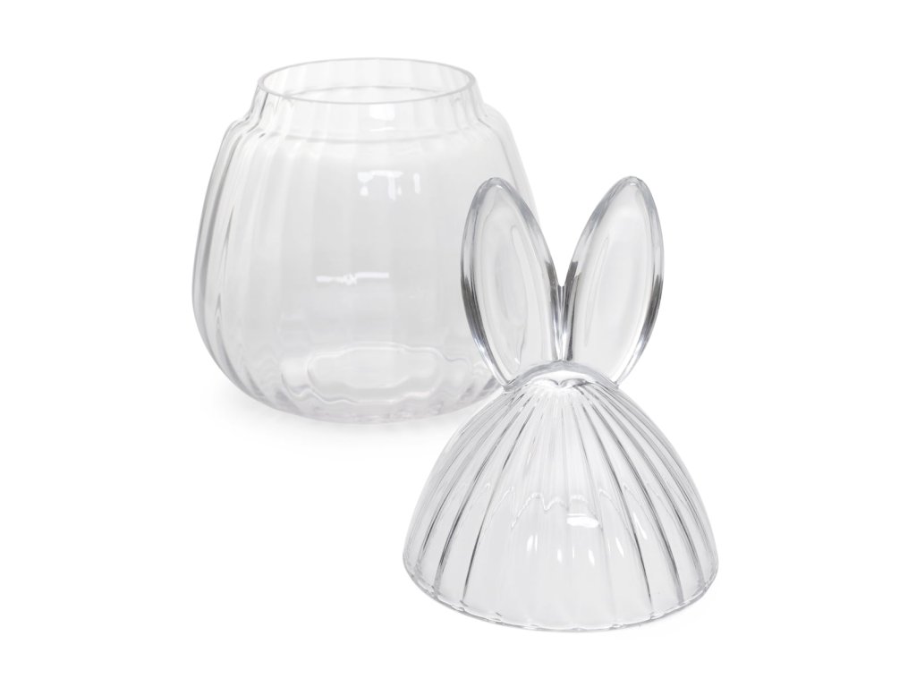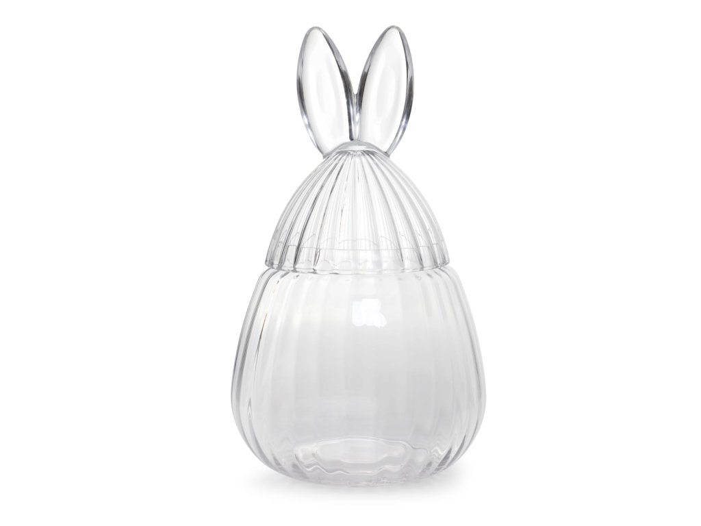 Nádoba má roztomilý tvar vejce s krásným víčkem ve tvaru králičích uší, které jí dodávají veselý a sváteční charakter. Elegantní forma rýhovaného skla mu dodává na eleganci a díky optimálním rozměrům najde své místo v každé místnosti. Průhledný materiál umožňuje vystavit jeho obsah, což z něj dělá ideální velikonoční dekoraci.