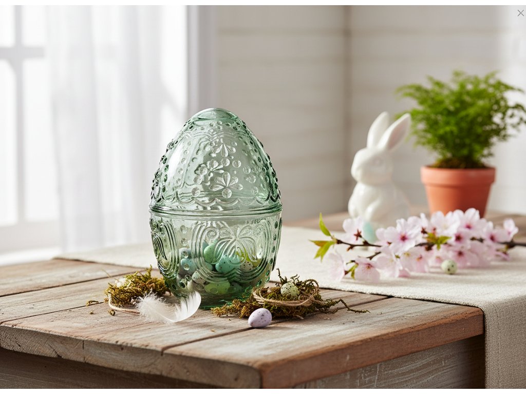 Vajíčko je skleněná miska se zaobleným tvarem vajíčka a malými rozměry 14x10 cm. Stěny jsou vyrobeny z průhledného skla s jemným odstínem zelené barvy. Jsou navíc zdobena strukturovaným vzorem připomínajícím arabesky - objevují se jemné tečky, květinové motivy a geometrické ornamenty. Velikonoční dekorace může být také zajímavým doplňkem slavnostního prostírání.