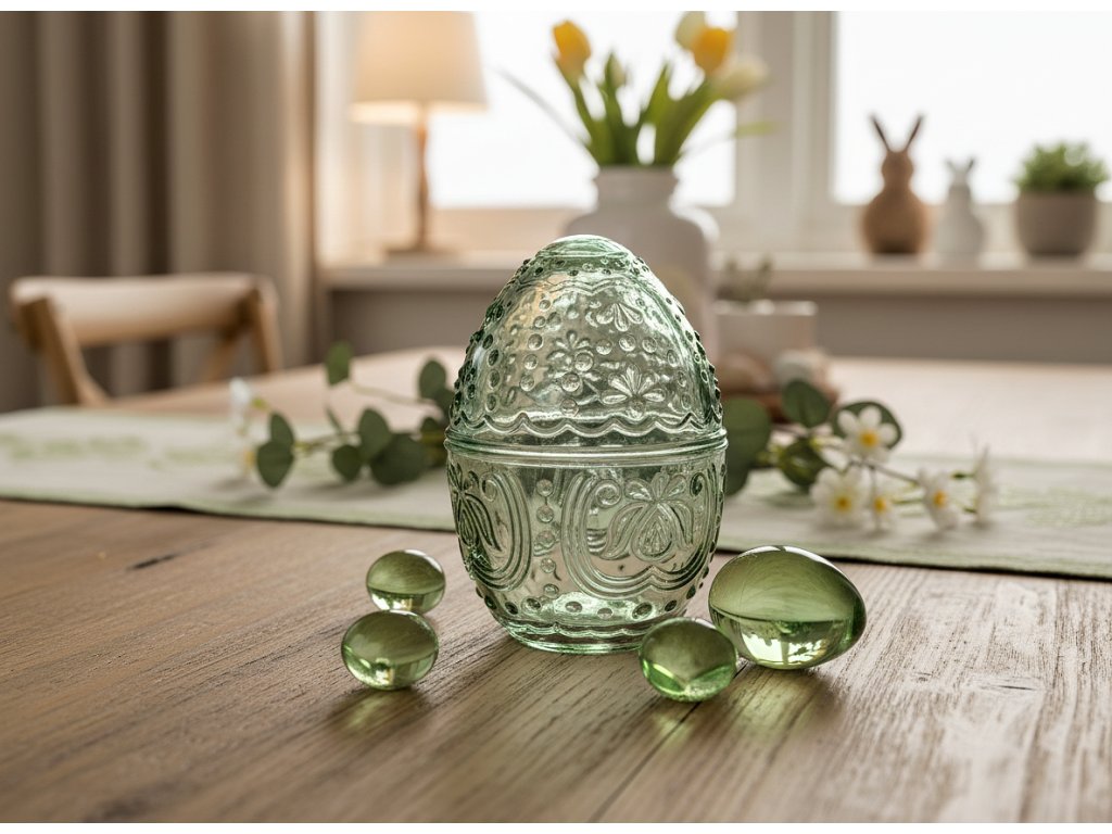 Zelená skleněná dekorace je velikonoční dekorace s všestranným využitím.