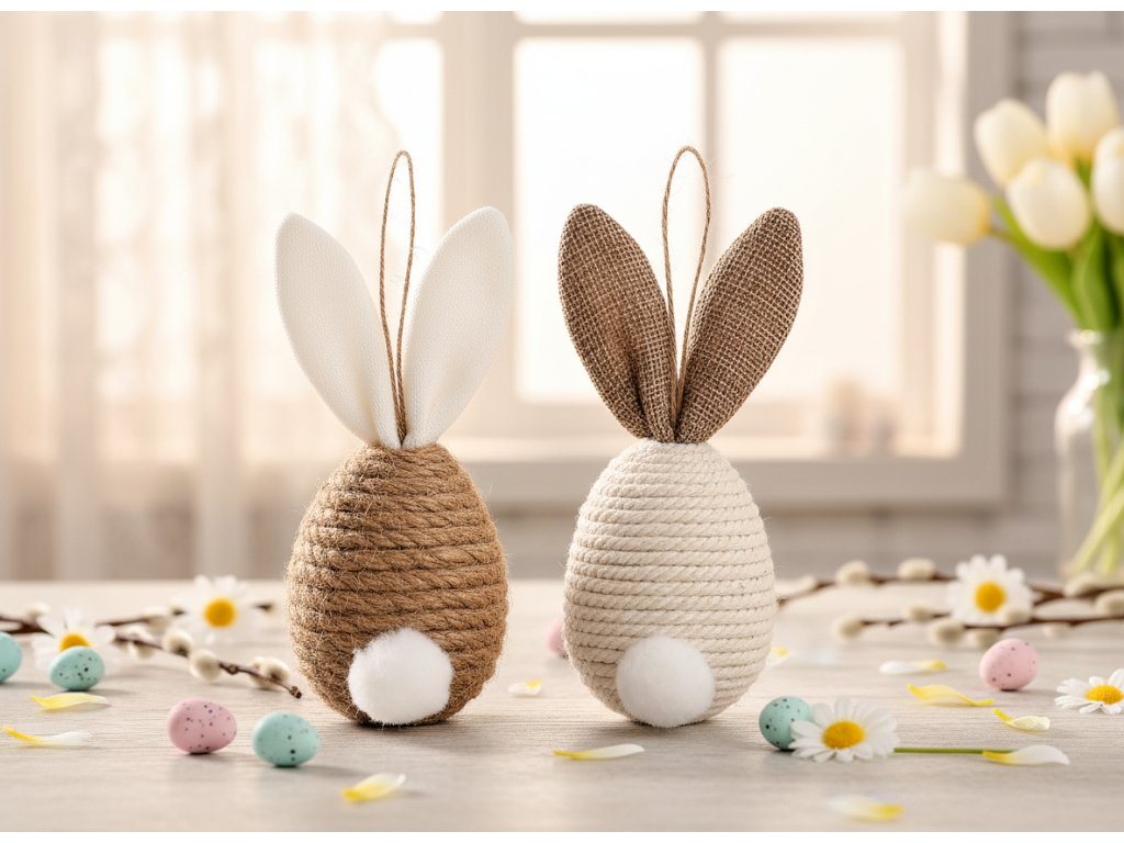 Sada přívěsků ve tvaru vajíček s roztomilými ušima dodá vašemu interiéru lehký, slavnostní nádech inspirovaný přírodou. Kombinace světlých, neutrálních tónů s jutovým povrchem vytváří příjemnou, klidnou kompozici, která se perfektně hodí k velikonočním dekoracím. Měkký bílý pompon dodává jemný a subtilní nádech.