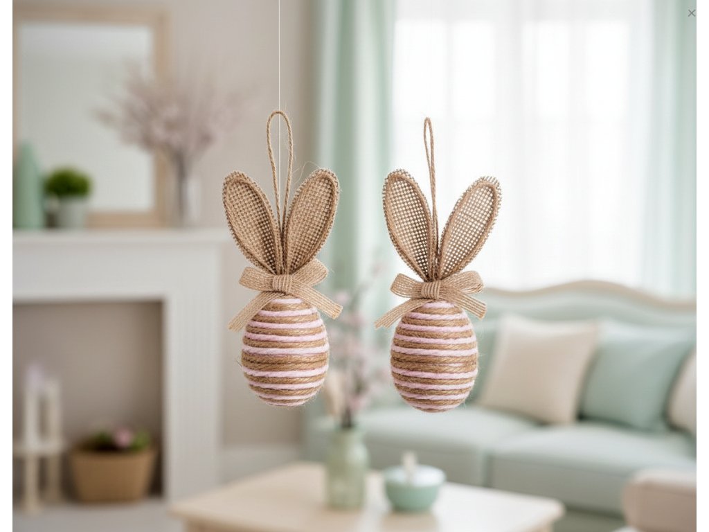 Dvoubarevné vzory v přírodních odstínech. - Vyrobeno z pěny a juty – lehký a odolný materiál. - Každé vajíčko má uši a provázek na zavěšení. - Ideální pro velikonoční a jarní dekorace interiéru.