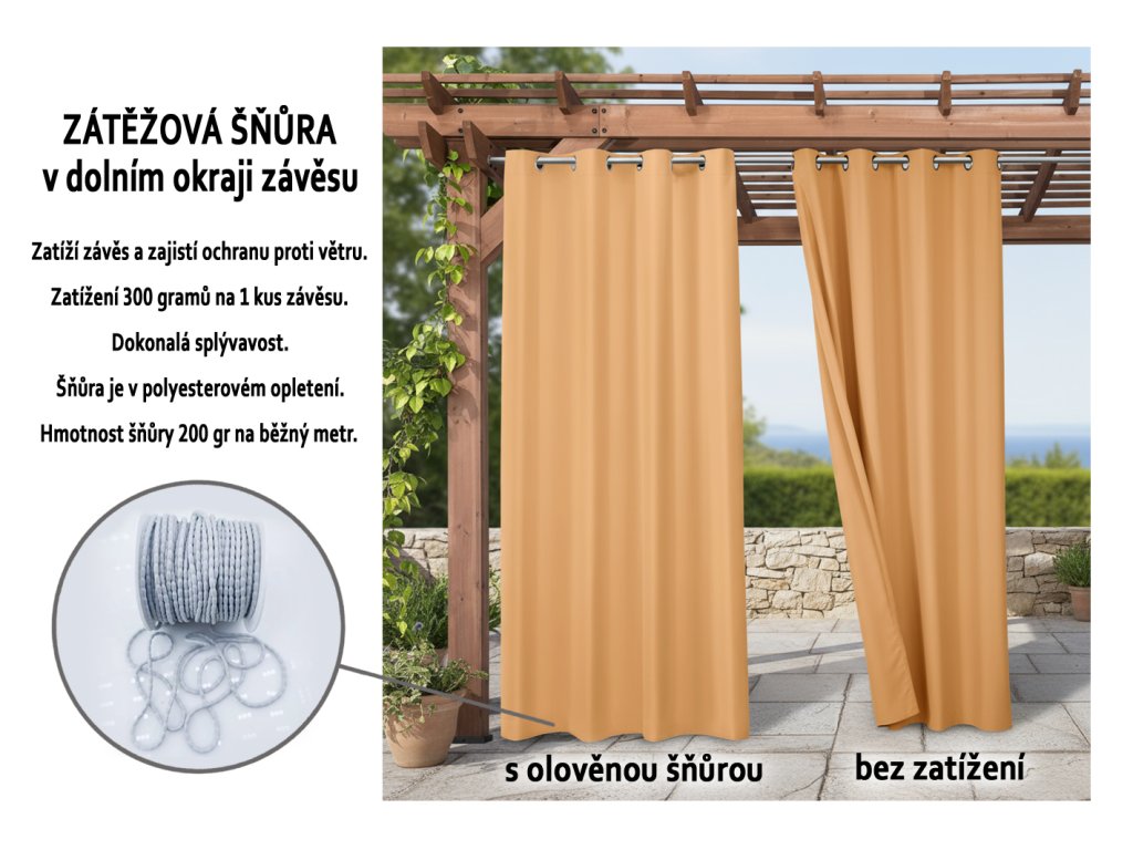 Voděodolný venkovní závěs je vyrobený z vysoce kvalitní látky. Je vhodný do pergoly, na balkón nebo do altánu. Závěs je odolný proti povětrnostním podmínkám, chrání před deštěm, eliminuje sluneční záření. Tkanina snáší nízké i vysoké teploty. Materiál je odolný proti poškrábání a poškození mechanickým způsobem. Závěs je oboustranný - stejná barva z rubu i lícu. Nedoporučujeme nechávat závěs svázaný delší dobu. V případě, pokud do svázaného závěsu nateče voda, doporučujeme nechat vyschnout, aby se v záhybech nevytvořila plíseň.