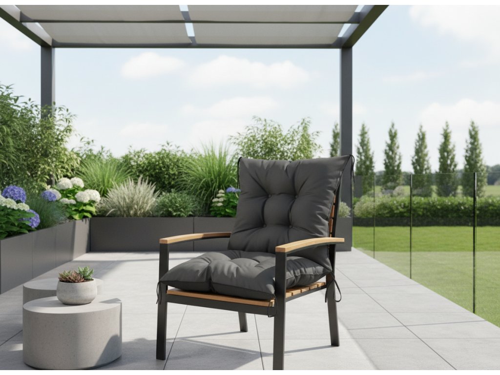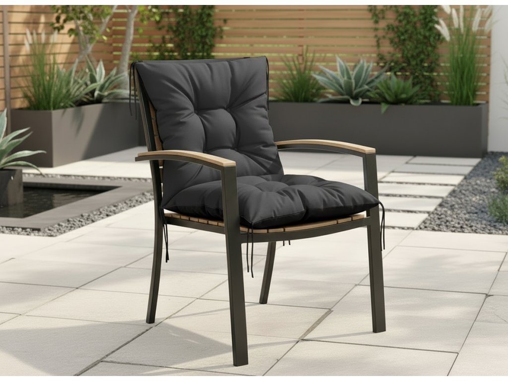 Voděodolná tkanina chrání před deštěm a vlhkostí, což zvyšuje její odolnost a usnadňuje udržování v čistotě. Polštář židle má správně dimenzovanou výplň, která zajišťuje pohodlí při sezení. Sedák je vybaven šňůrkami, které slouží k jeho přivázání k židli. Tím je zajištěno, že sedák zůstane na svém místě a během používání se nepohybuje.