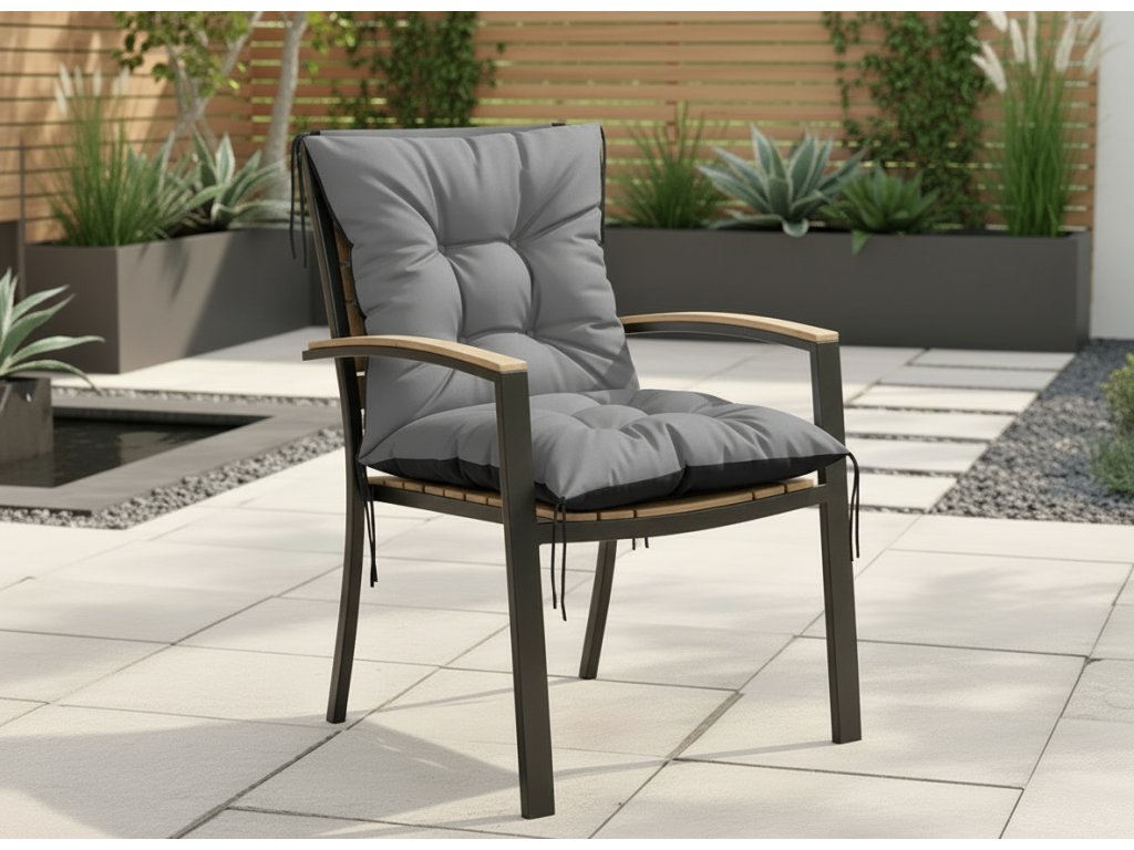 Voděodolná tkanina chrání před deštěm a vlhkostí, což zvyšuje její odolnost a usnadňuje udržování v čistotě. Polštář židle má správně dimenzovanou výplň, která zajišťuje pohodlí při sezení. Sedák je vybaven šňůrkami, které slouží k jeho přivázání k židli. Tím je zajištěno, že sedák zůstane na svém místě a během používání se nepohybuje.